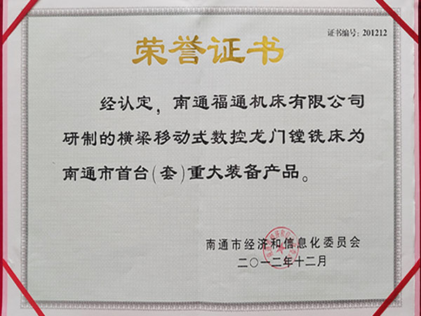 我公司研制的橫梁移動式數(shù)控龍門鏜銑床為“南通市首臺(套)重大裝備產(chǎn)品”。