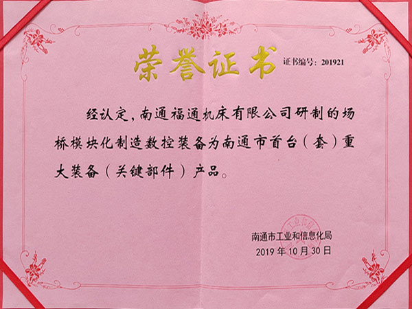 南通福通機床有限公司研制的場橋模塊化制造數(shù)控裝備,2019年榮獲“南通市首臺(套)重大裝備(關(guān)鍵部件)產(chǎn)品”。
